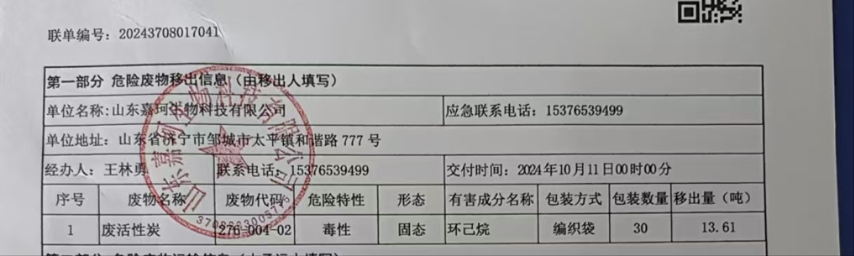 【概要描述】山东嘉珂生物科技有限公司2024年9月份废活性炭13.61吨2024年10月11日由专业处理公司转移处理。
